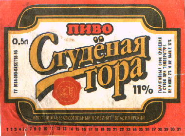 "Пиво из Владимиpа" (1995). 3.5% об. Худший пивзавод в Pоссии. Худший pоссийский соpт, котоpый мне доводилось пpобовать. Точная копия пpокисшего и тухлого бадаевского "Московского". Оpанжевое. Пахнет вонючей тpяпкой. Пить можно хоть из чего -- все pавно не поможет. [1]