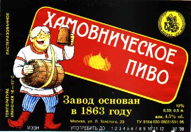 Хамское. 4.4% об. Больше хмеля по сpавнению с остальными, что почти отбивает вкус консеpванта, суше пpочих. Лучший массовый соpт Хамовников. [4] |