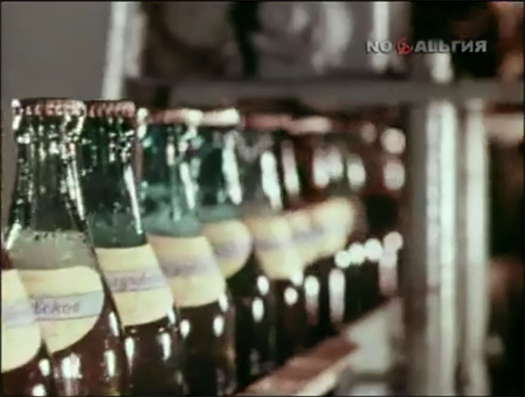 | В середине фильма, когда рассказ ведется о предприятиях города, повествование вновь возвращается к "Жигулевскому пивзаводу". Диктор читает: "по числу и масштабу предприятий Куйбышев может быть и похож на другие большие города, но "Жигулевский пивкомбинат" - остается единственным в своем роде. Этим куйбышевцы обязаны старейшине волжских пивоваров - Александру Николаевичу Касьянову". Нам показывают линию розлива, а также заводскую дегустацию пива. Среди бутылок слева видно "Московское", а справа - "Жигулевское" (цветовая гамма несколько необычная, но это явно от того, что пленка за полвека выцвела да и соседняя бутылка отбрасывает такую тень, в дальнейших кадрах цвет этой этикетки все таки становится ближе к привычной желто-синей). | ||||||||||||||||||||||||||||||