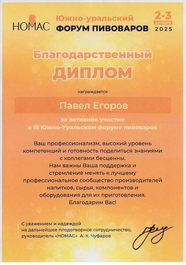 | Сертификат и диплом Научной конференции пивоваров Волга beer pro. |