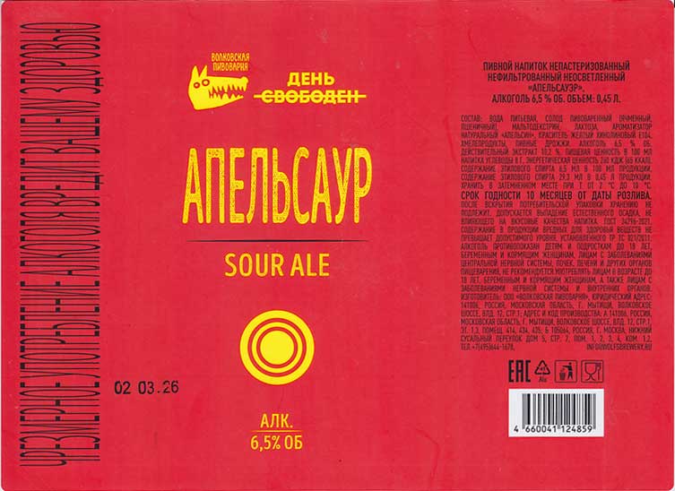 Апельсауэр. Светлое. Крепость - 6,5% vol. Калорийность - 65 ккал. |