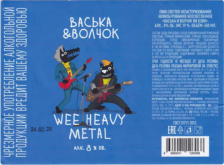 Васька и Волчок, ви хэви. Светлое. Плотность - 19%. Крепость - 8% vol. Калорийность - 75 ккал. |