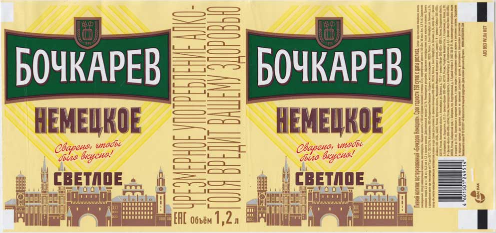 | "Объединенные пивоварни - Холдинг", "Бочкарев, немецкое". Судя по очередности указания ингредиентов - в этом сорте больше несоложенного ячменя чем соложенного, потому это - "пивной напиток", а не пиво. Особенно доставляет, что это относится к "Немецкому" пиву, хотя ведь в так называемом Законе о чистоте пива от 1516-го года был указан именно ячмень (а не солод, как трактуют данный закон сейчас), но в любом случае, Закону от 1516-го года сорт не соответствует, в нем указаны еще и дрожжи, которых ранее не было. Что в итоге вышло - вкус мокрого зерна, но в общем довольно питко, особенно под воблу. Хотя вобла стала совсем уж элитной рыбой, так что скорее под вяленого леща - выйдет очень бюджетно и весьма посконно. |