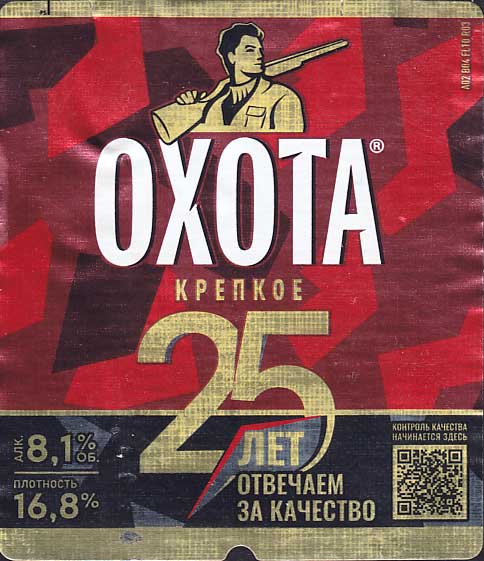"Охота, крепкое", этикетка к 25-ти летию сорта. Хотя обычно "Охоту" считают довольно маргинальным напитком, на самом деле, в своем стиле (крепкий лагер) - это практически идеальное пиво (что кстати доказывают "слепые" дегустации, где сорт всегда в лидерах). Может не стоит этот сорт пить первым, но если его выпить сразу после какого-нибудь пустого евролагера или "грязного" регионального сорта, то сразу ощущаешь насколько это полное и чистое по вкусу пиво. Вкус солодовый, чуть винный, алкоголь при этом не давит. Для стиля "бок" - может несколько не хватает яркости, но как крепкий лагер - отлично.