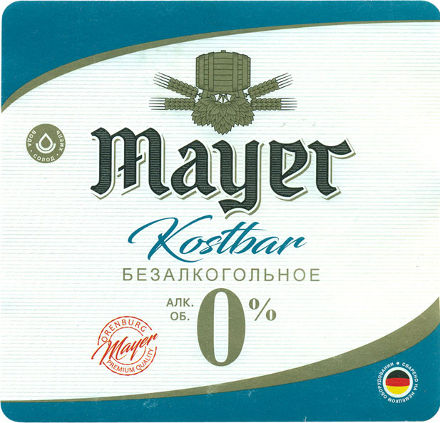 | Оренбургский завод "Крафт", безалкогольный сорт "Майер, костбар". После того как для производства безалкогольных сортов все стали использовать дрожжи не потребляющее лактозу, безалкогольные сорта явно стали лучше, но малоразличимы у разных производителей. В данном случае все вышло хорошо - вкус "бархатный", ощутим и солод и хмель и почти нет привкуса невыброженного сусла. |