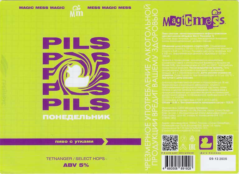 | Наконец, последнее что пил - питерская пивоварня Magic mess и их "Pils" ("Понедельник") - вкус весьма чистый, хмель ощутим и в аромате и во вкусе, все довольно гармонично, легко и питко. |