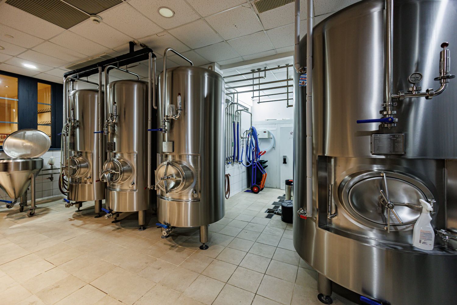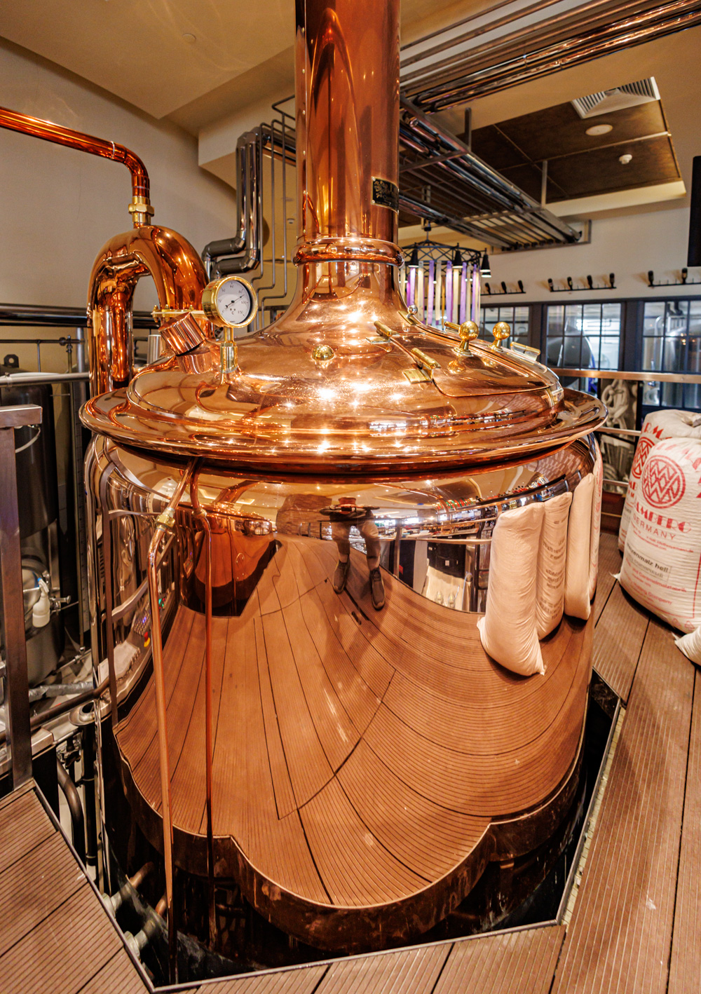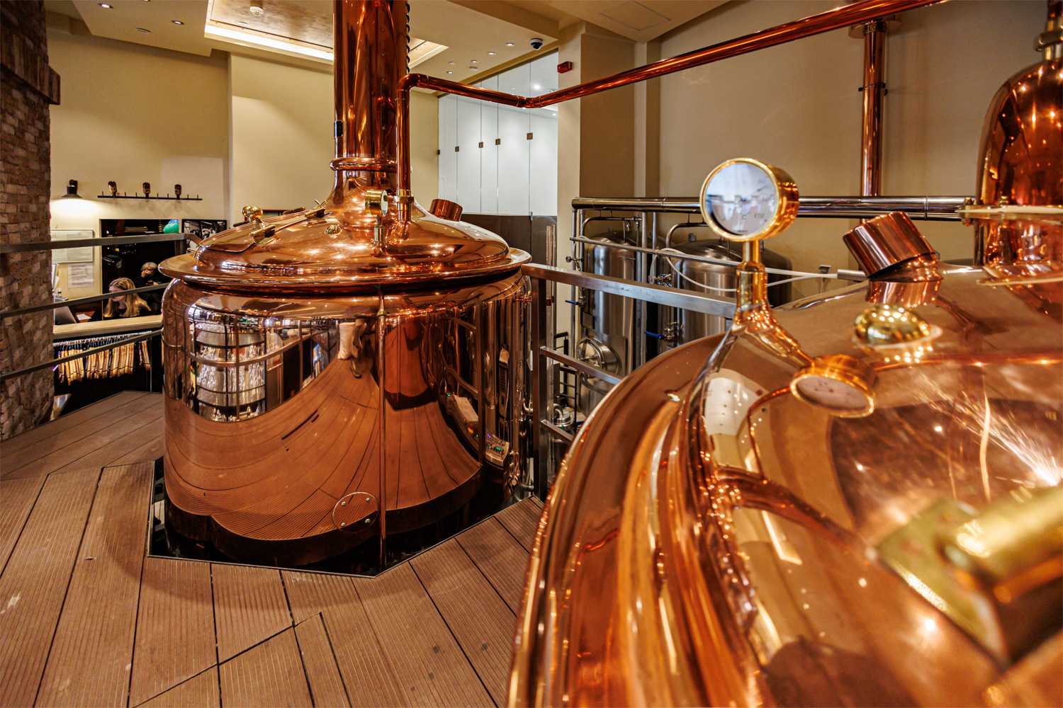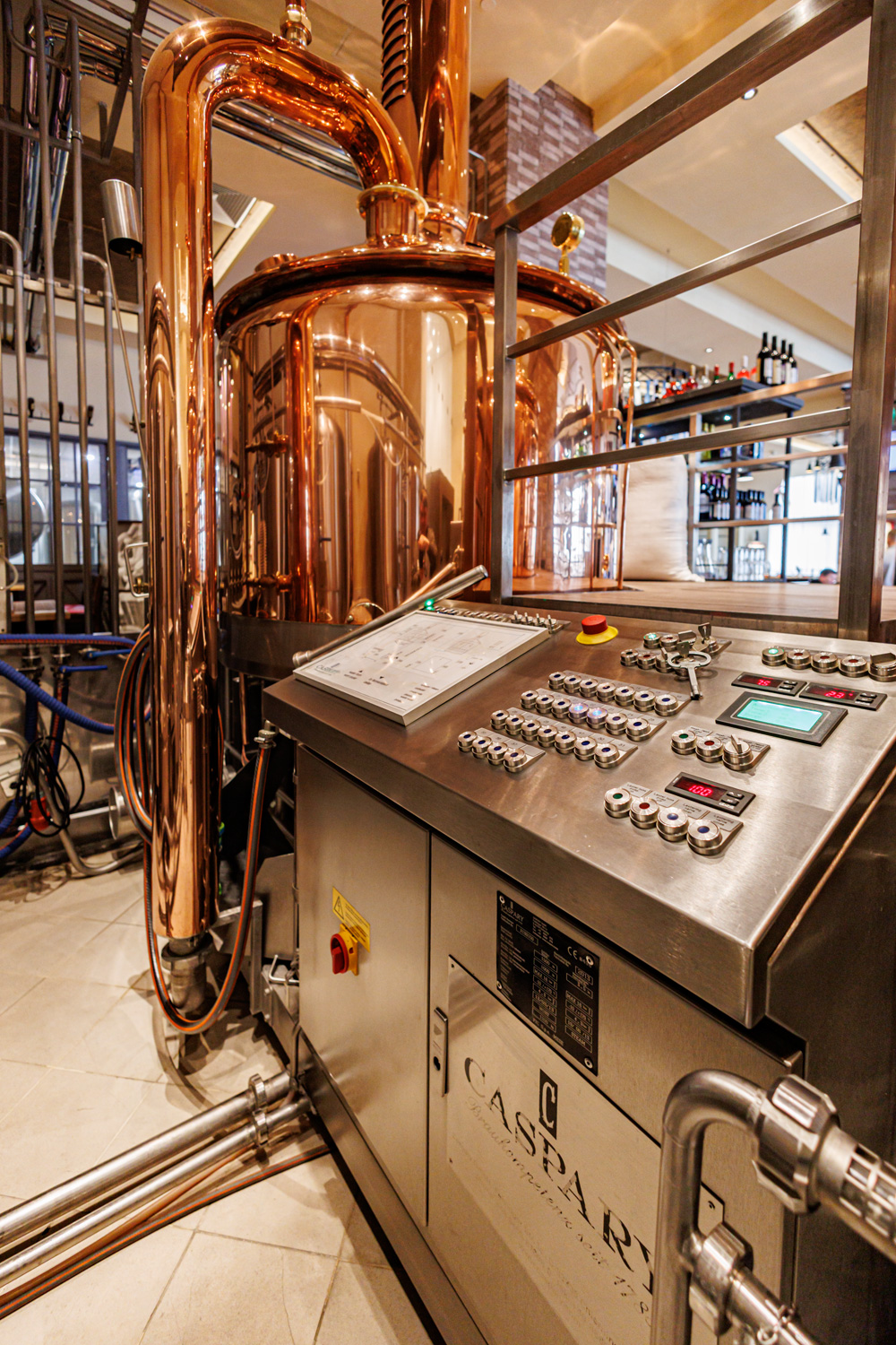 Совсем рядом с Maximilian's, на той же улице Труда (но дом 179) расположен ресторан-пивоварня еще одной сети - Paulaner brauhaus (в здании Radisson Blu Hotel). Тоже посетил не один такой Paulaner и тоже могу сказать что челябинский - один из лучших. Интерьер ресторана вполне типичный, в стиле баварских пивных, посреди большого зала, за стойкой, установлен варочный порядок пивоварни от компании Caspary, отделанный медью и начищенный до блеска. Удалось посмотреть не только варочник, Максим Сапожников, главный пивовар, провел экскурсию и по цеху брожения. Брожение проводится в открытых танках, что встретишь не так уж часто, дображивание в закрытых вертикальных емкостях.