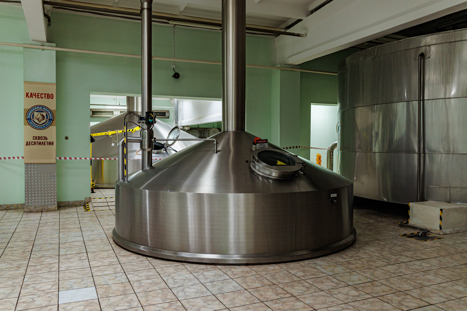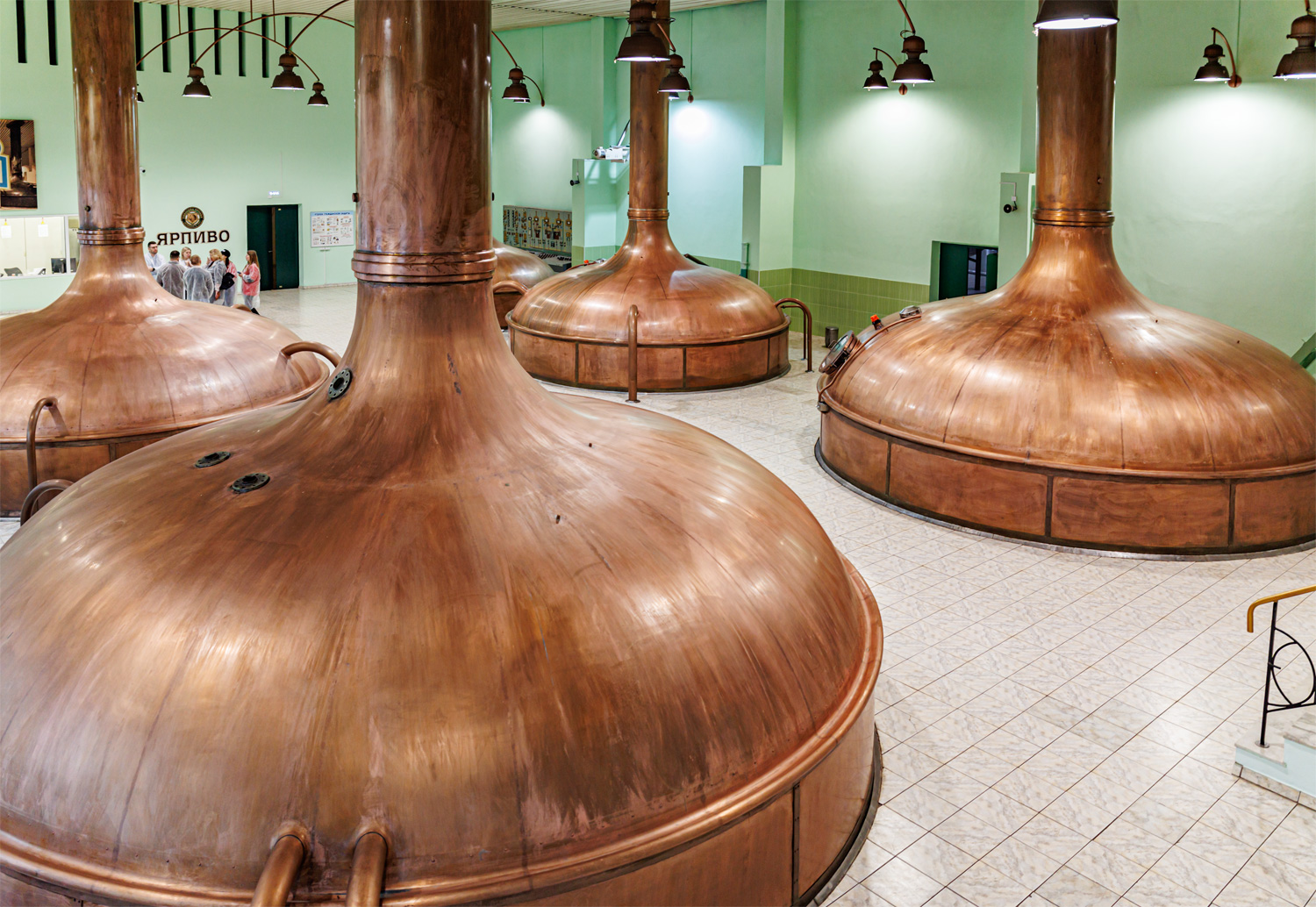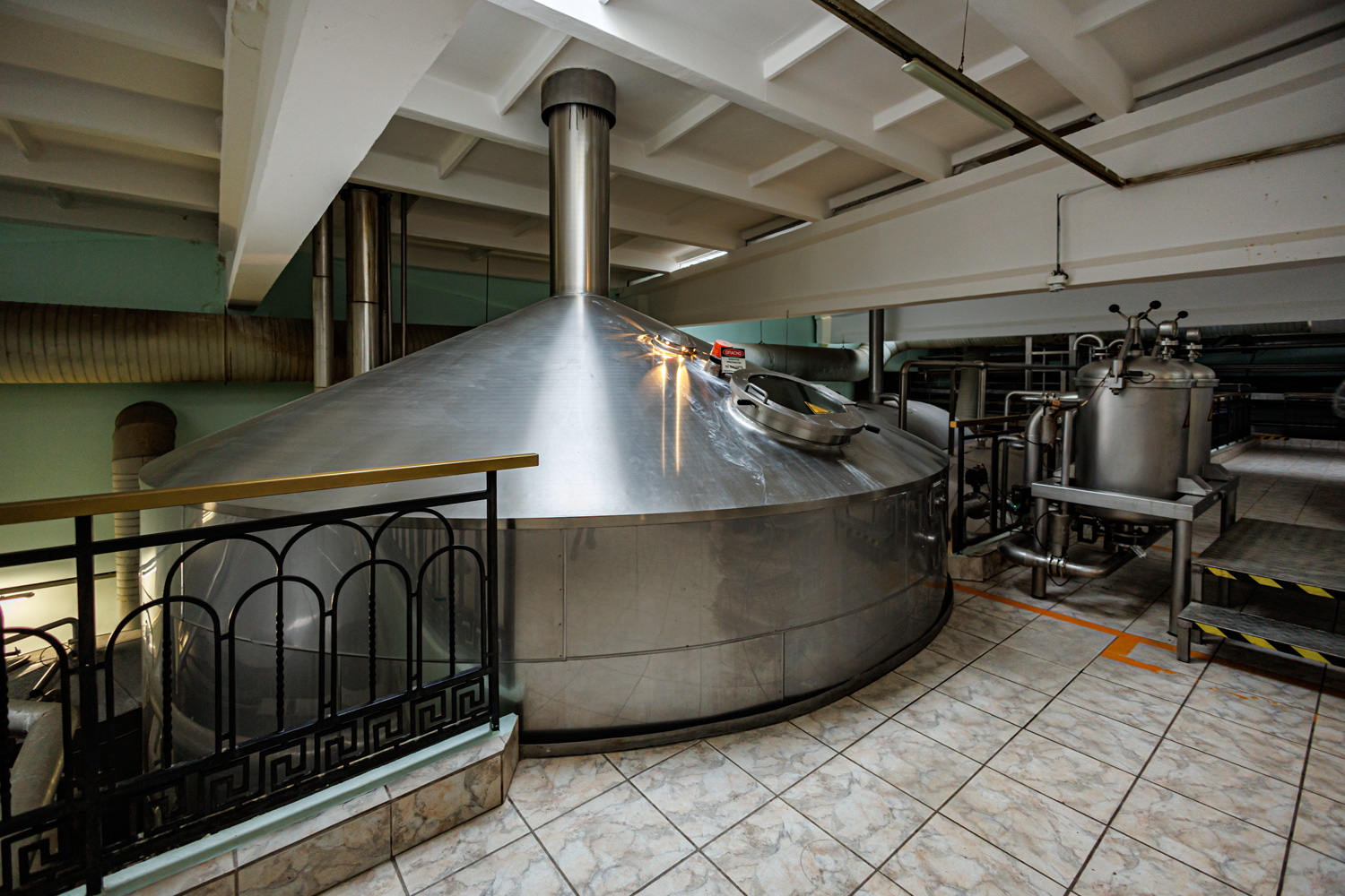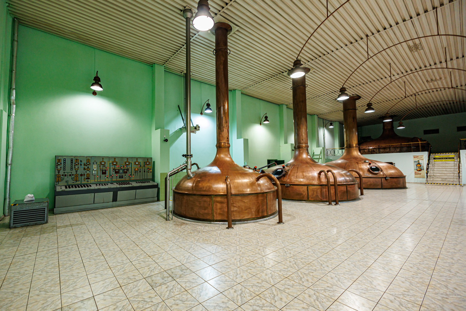 | Варочный цех. Сохранились медные чехословацкие котлы, но они используются только как облицовка для современных котлов из нержавейки. Старый пульт управления варкой тоже оставлен как музейный экспонат, сейчас все управление производится с помощью компьютеров из операторской. | ||||||||||||||||||||||||||||||||