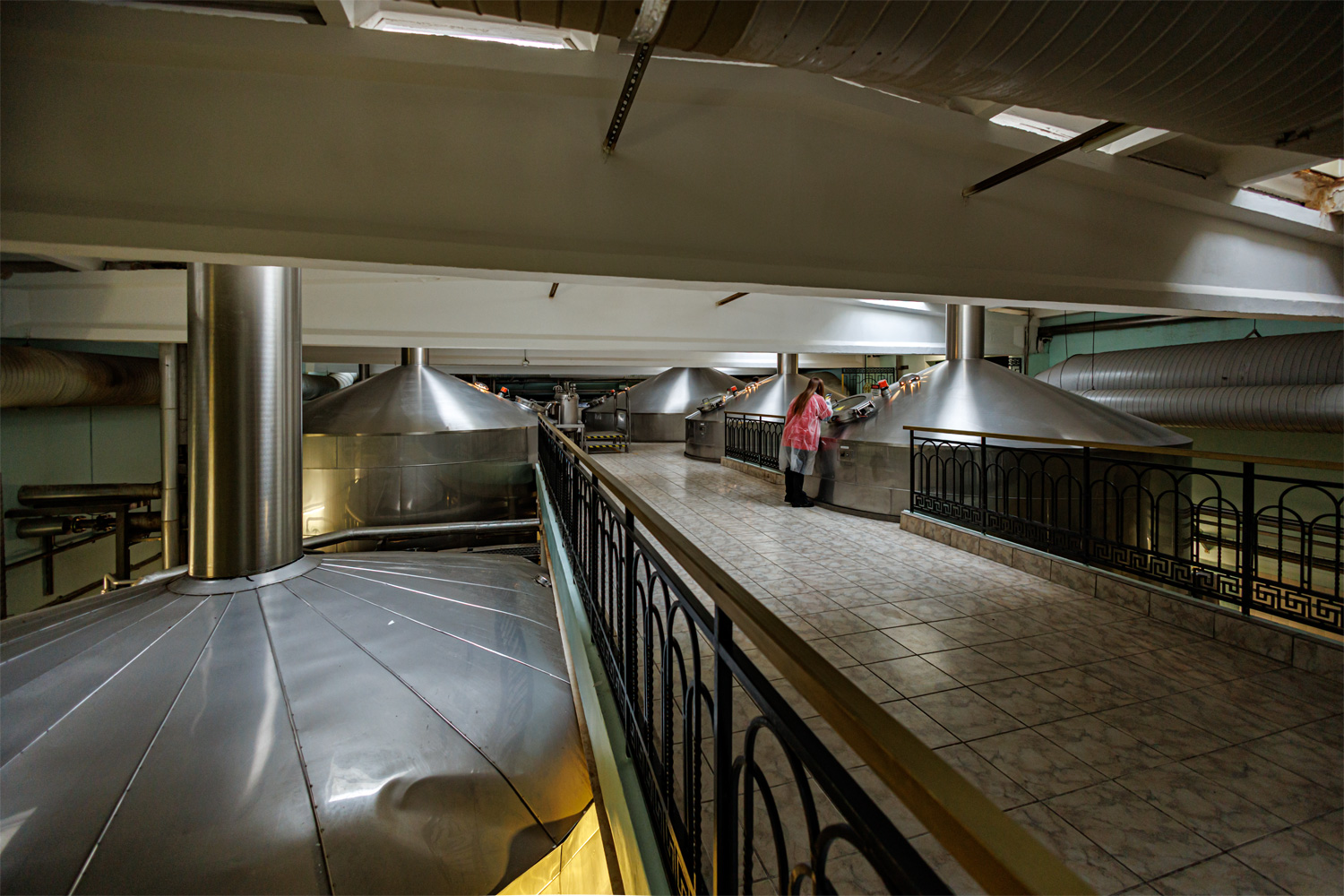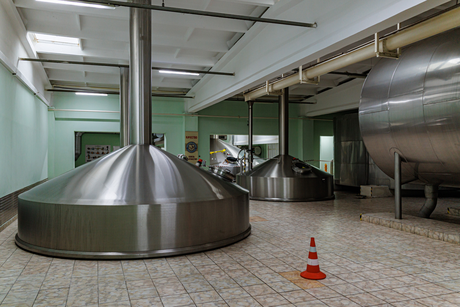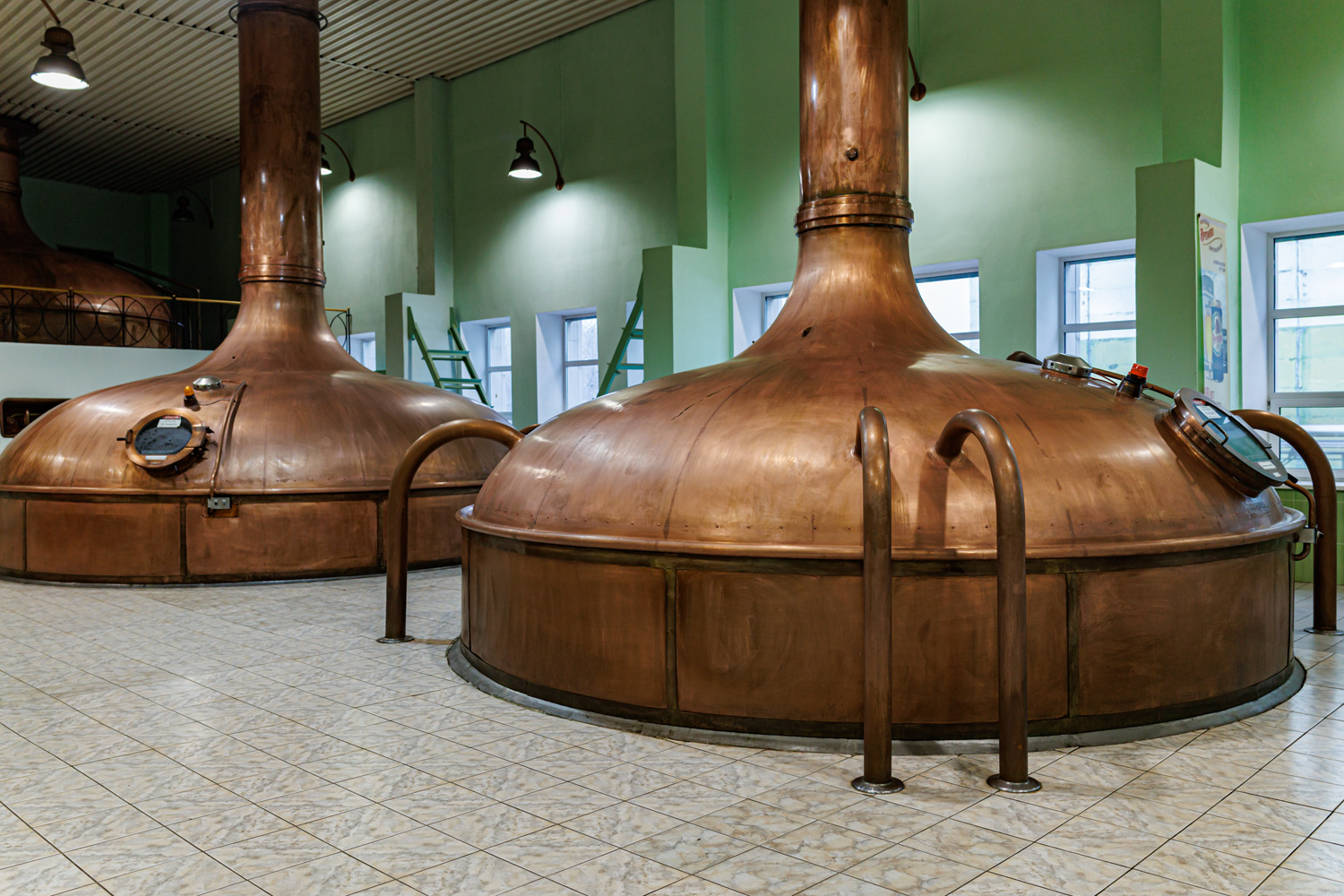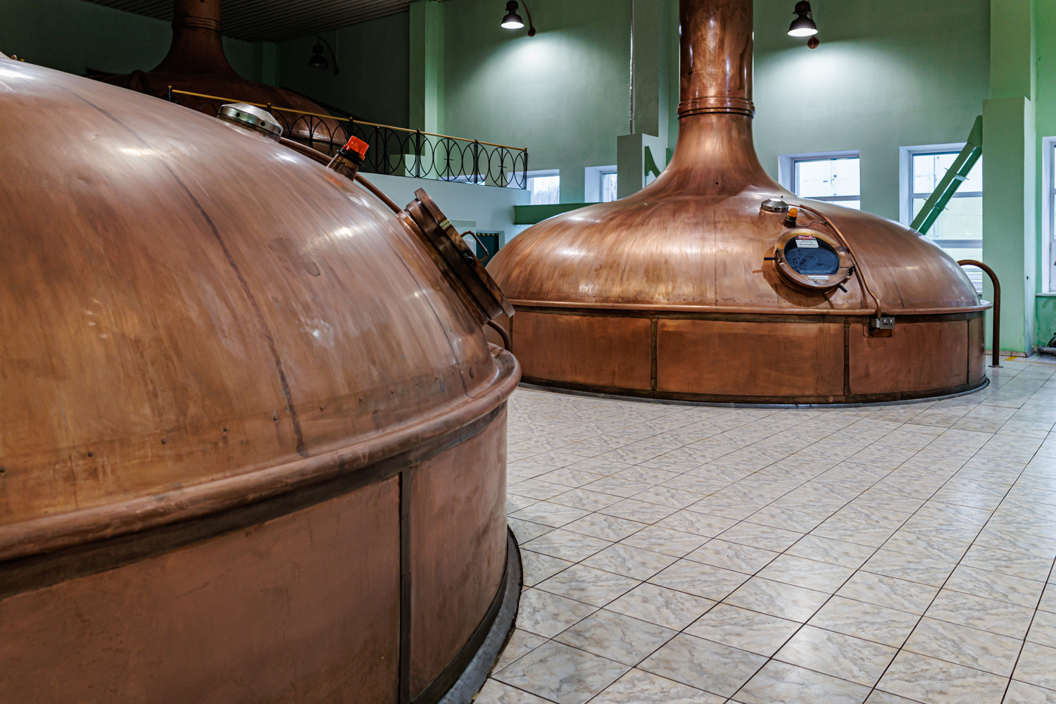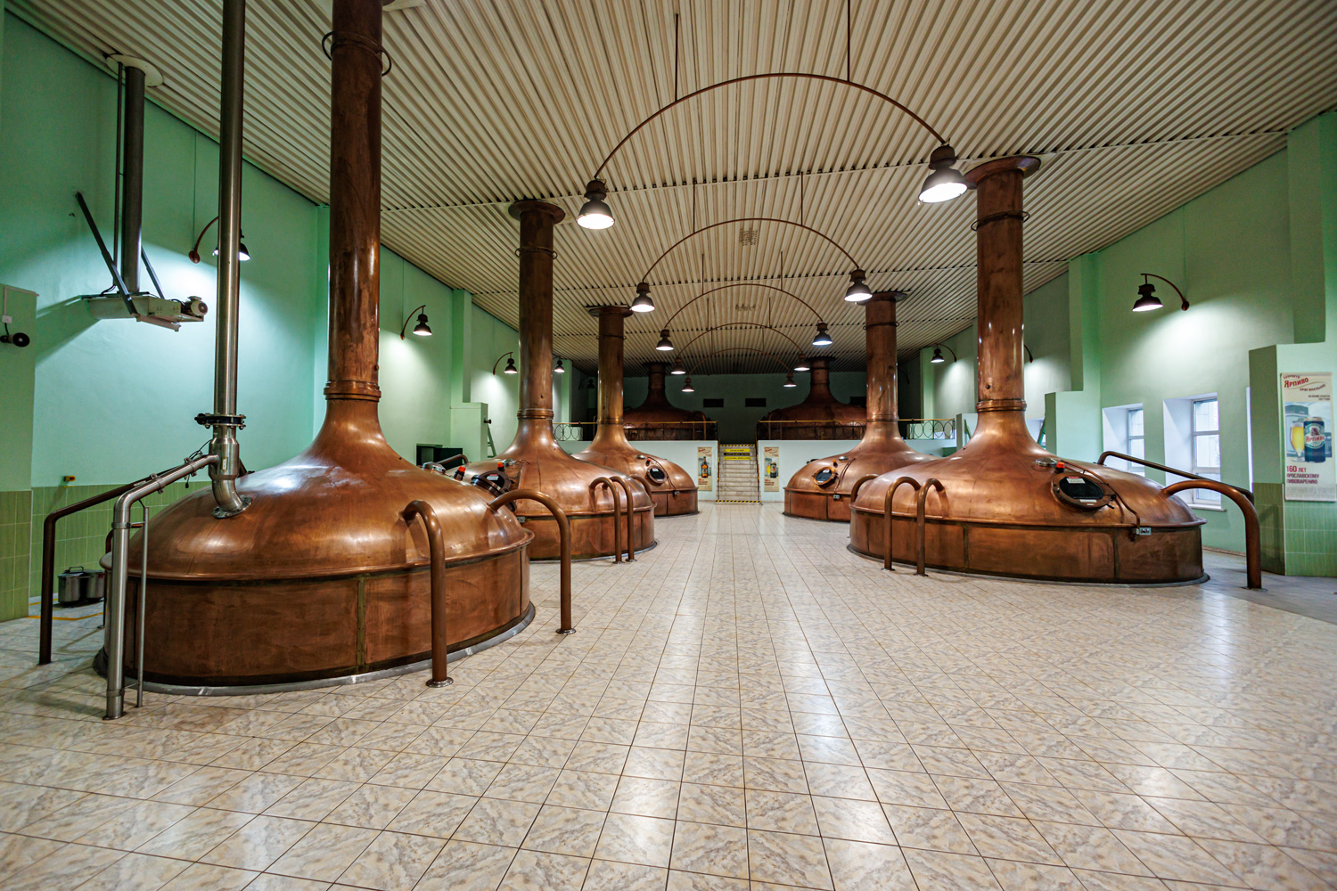 | Варочный цех. Сохранились медные чехословацкие котлы, но они используются только как облицовка для современных котлов из нержавейки. Старый пульт управления варкой тоже оставлен как музейный экспонат, сейчас все управление производится с помощью компьютеров из операторской. | ||||||||||||||||||||||||||||||||