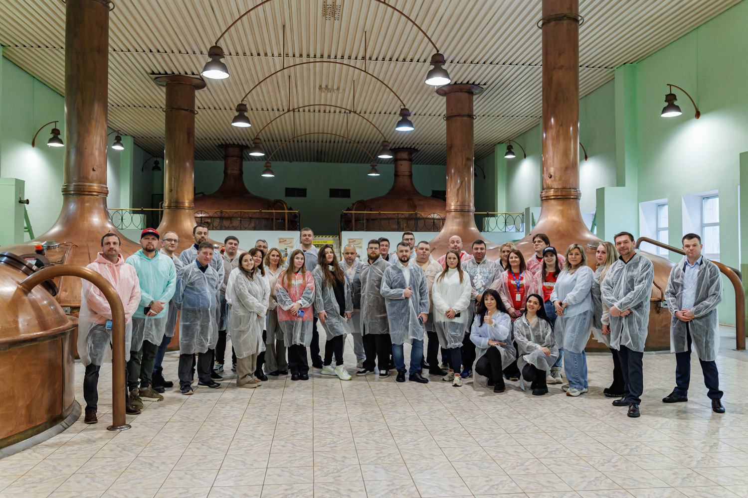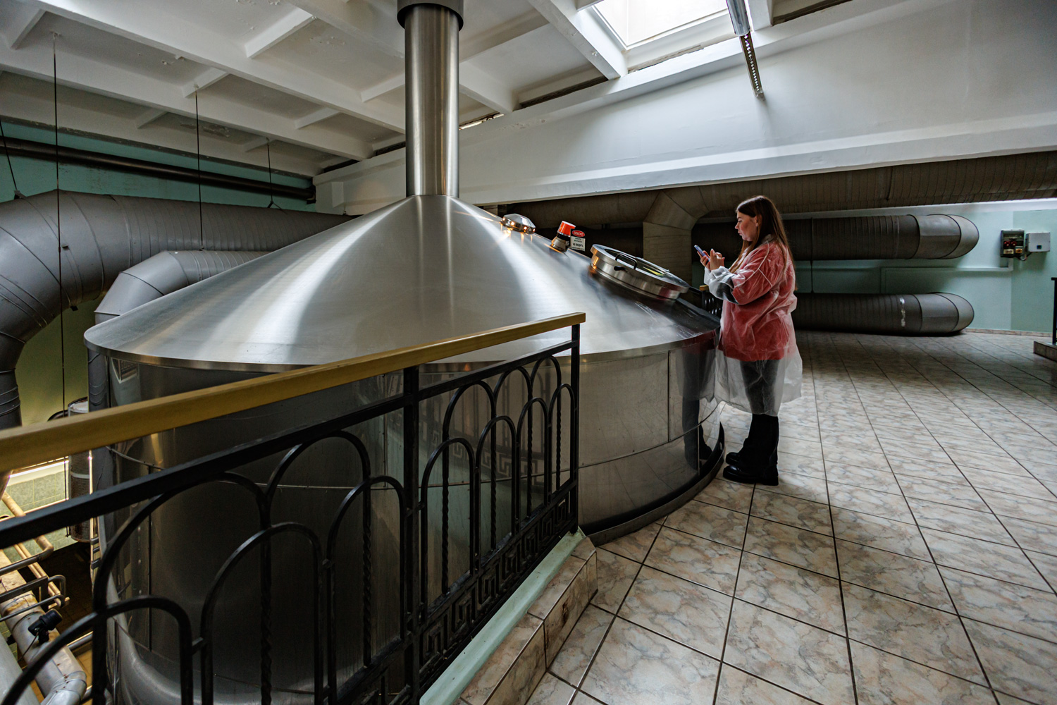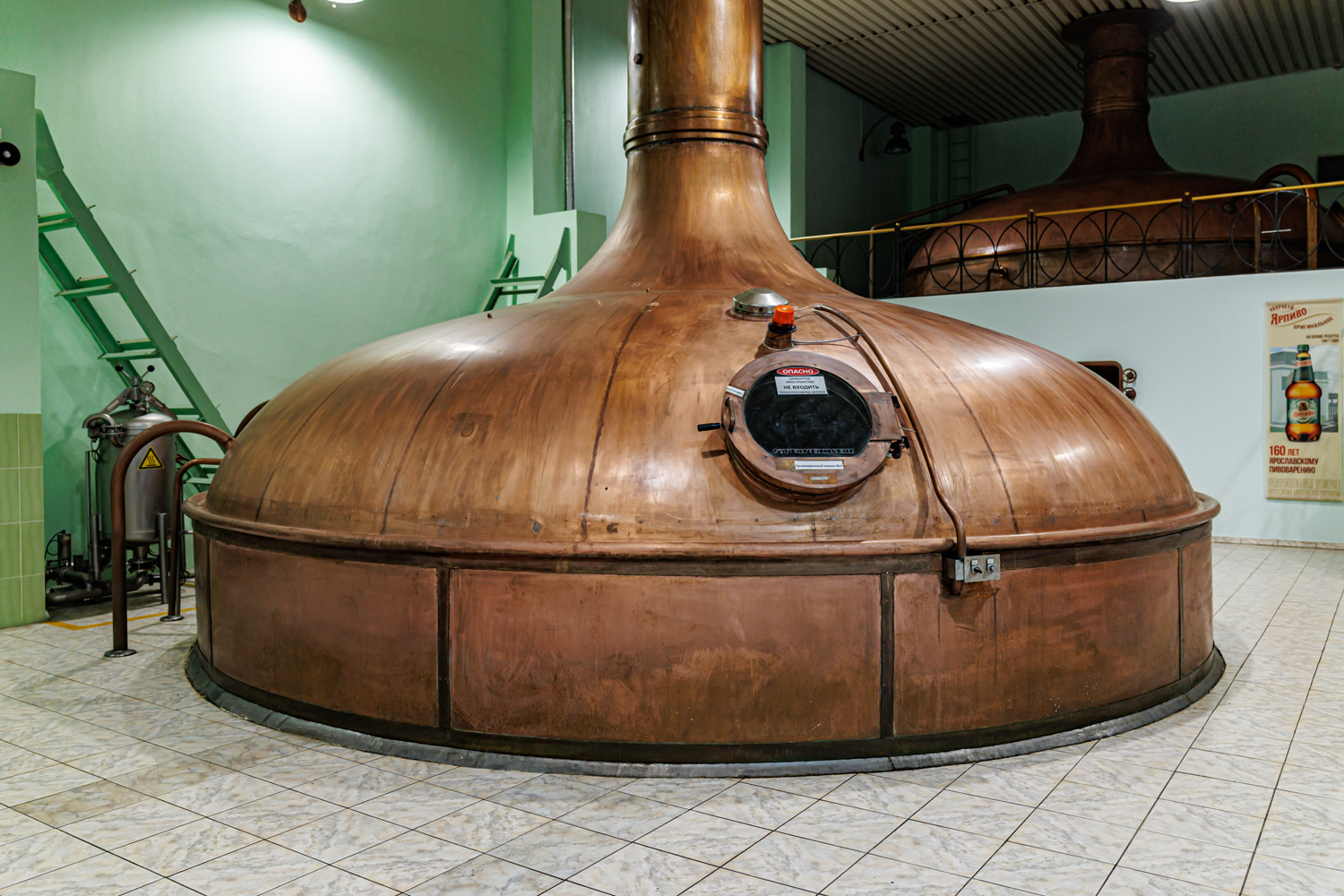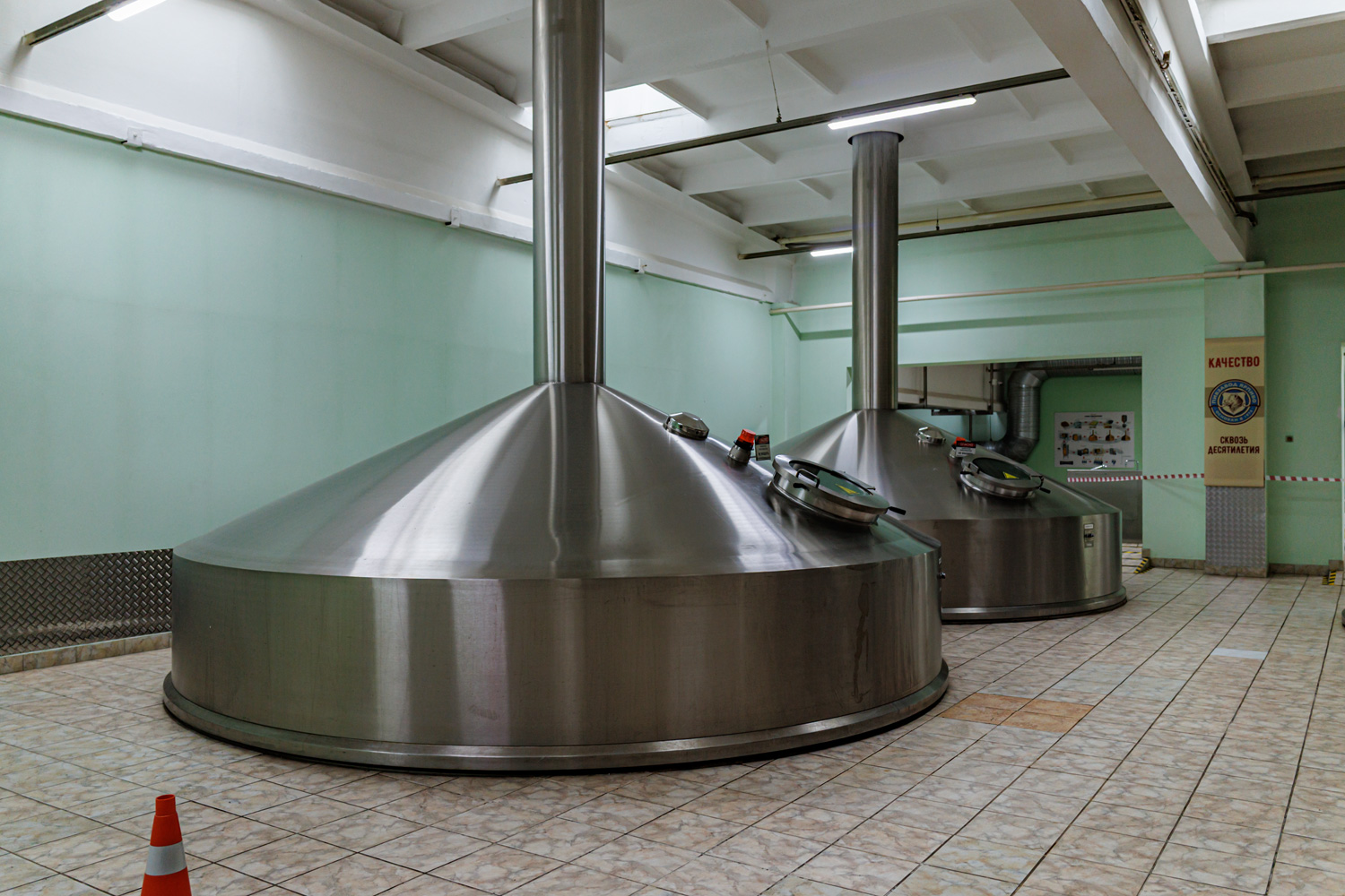 | Варочный цех. Сохранились медные чехословацкие котлы, но они используются только как облицовка для современных котлов из нержавейки. Старый пульт управления варкой тоже оставлен как музейный экспонат, сейчас все управление производится с помощью компьютеров из операторской. | ||||||||||||||||||||||||||||||||