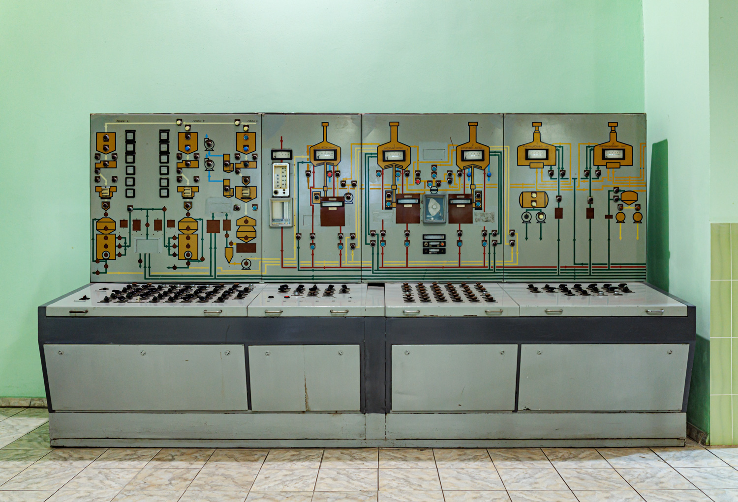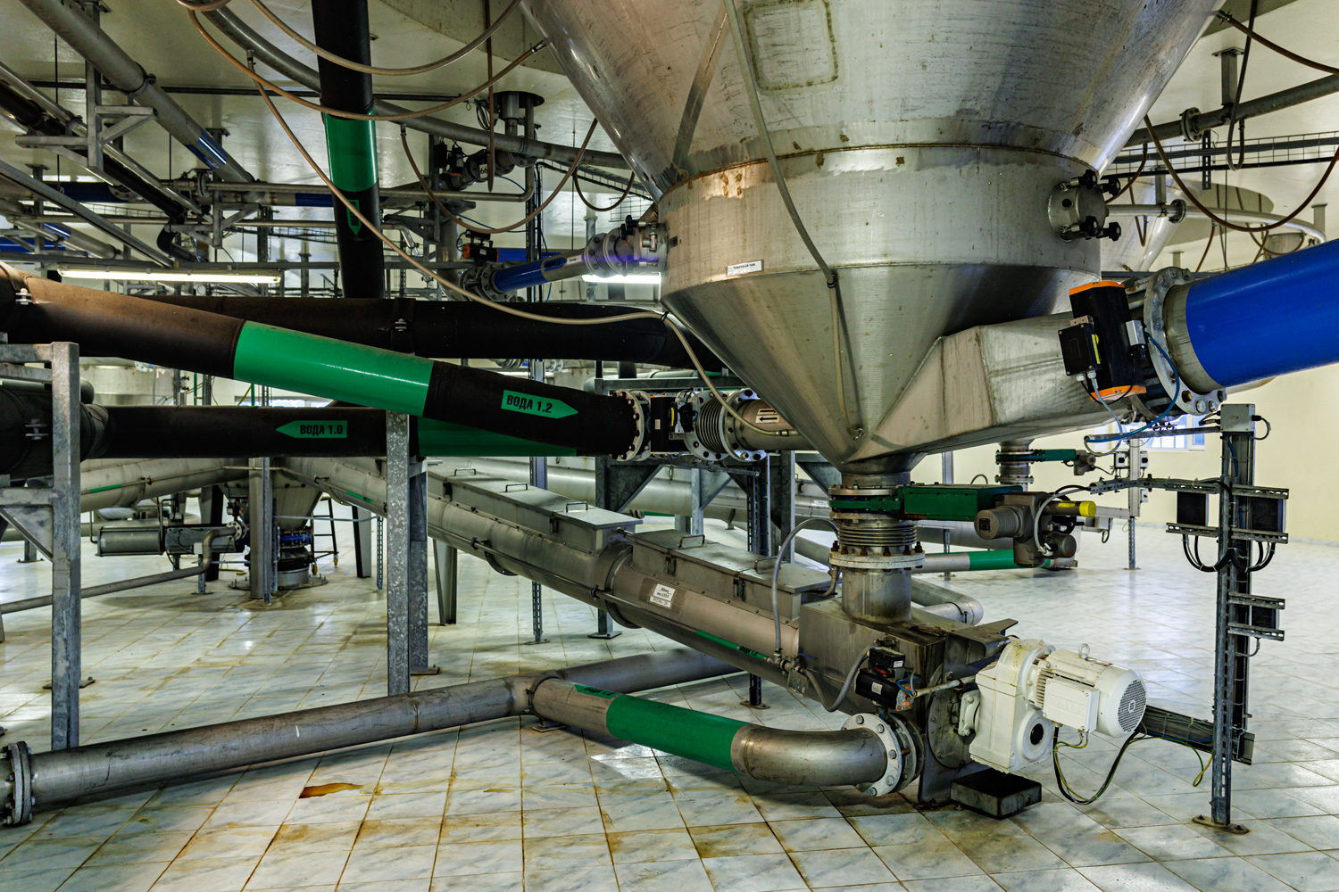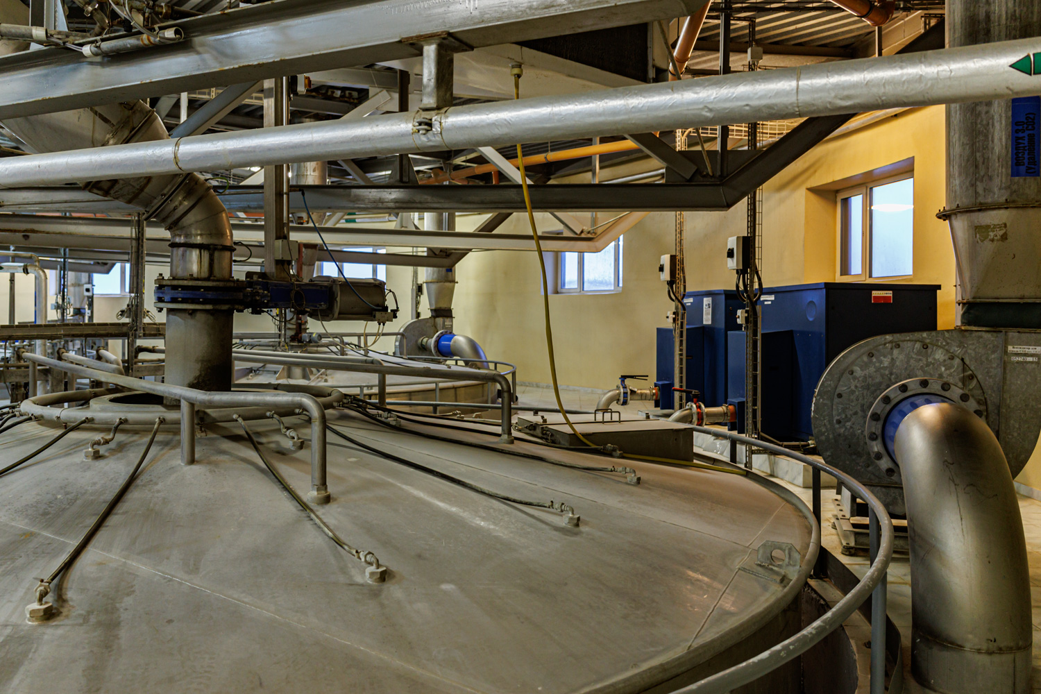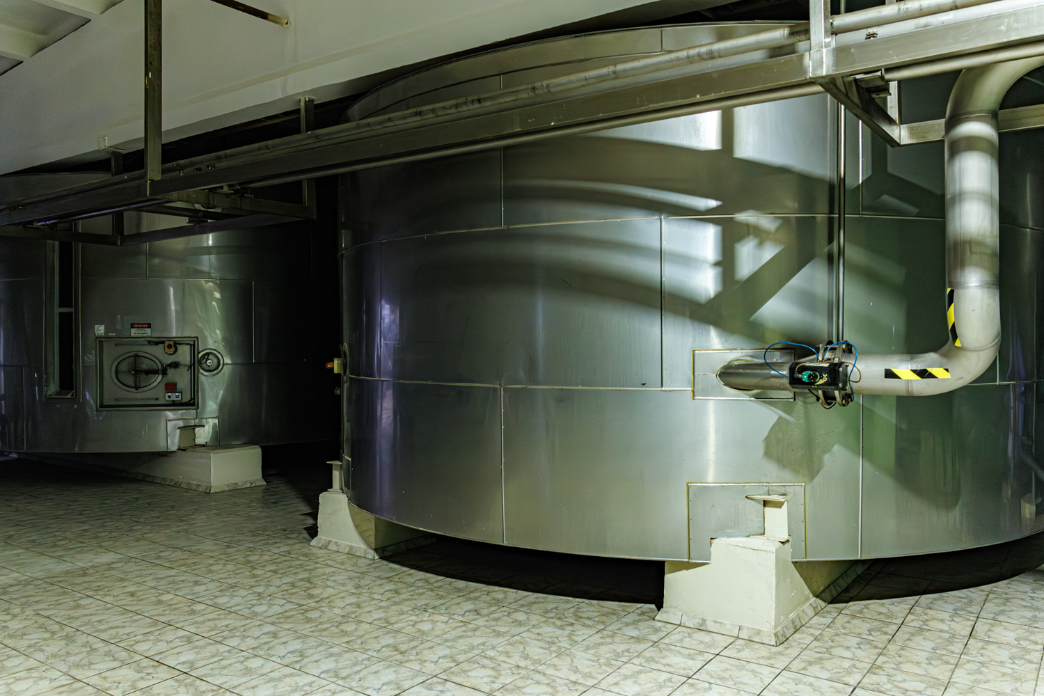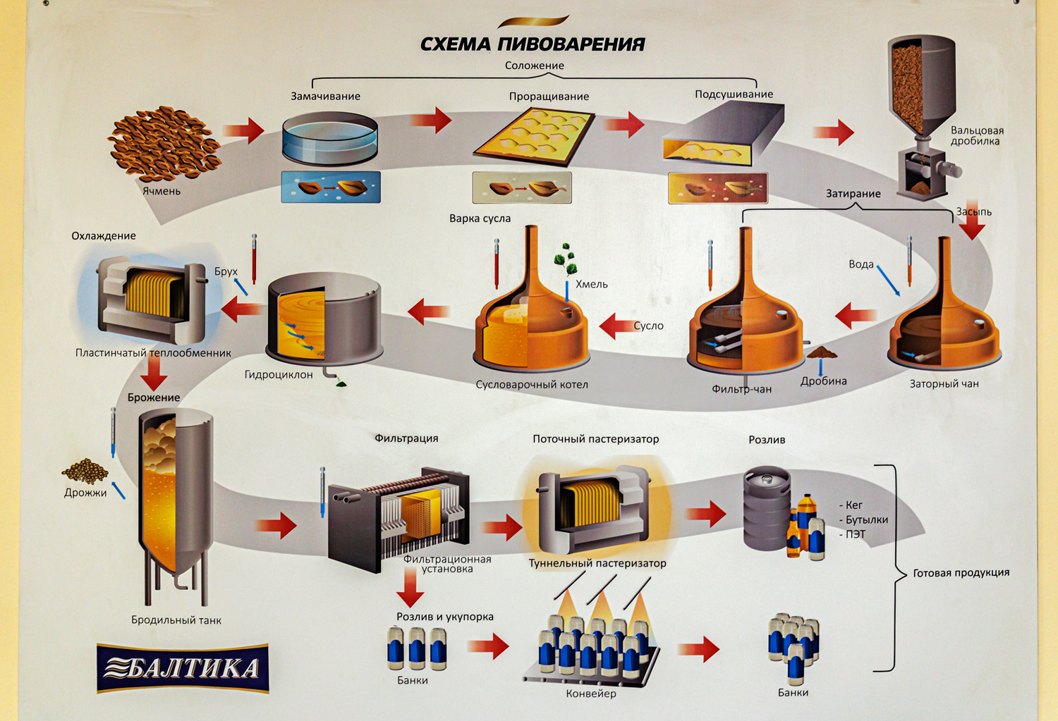 | Варочный цех. Сохранились медные чехословацкие котлы, но они используются только как облицовка для современных котлов из нержавейки. Старый пульт управления варкой тоже оставлен как музейный экспонат, сейчас все управление производится с помощью компьютеров из операторской. | ||||||||||||||||||||||||||||||||