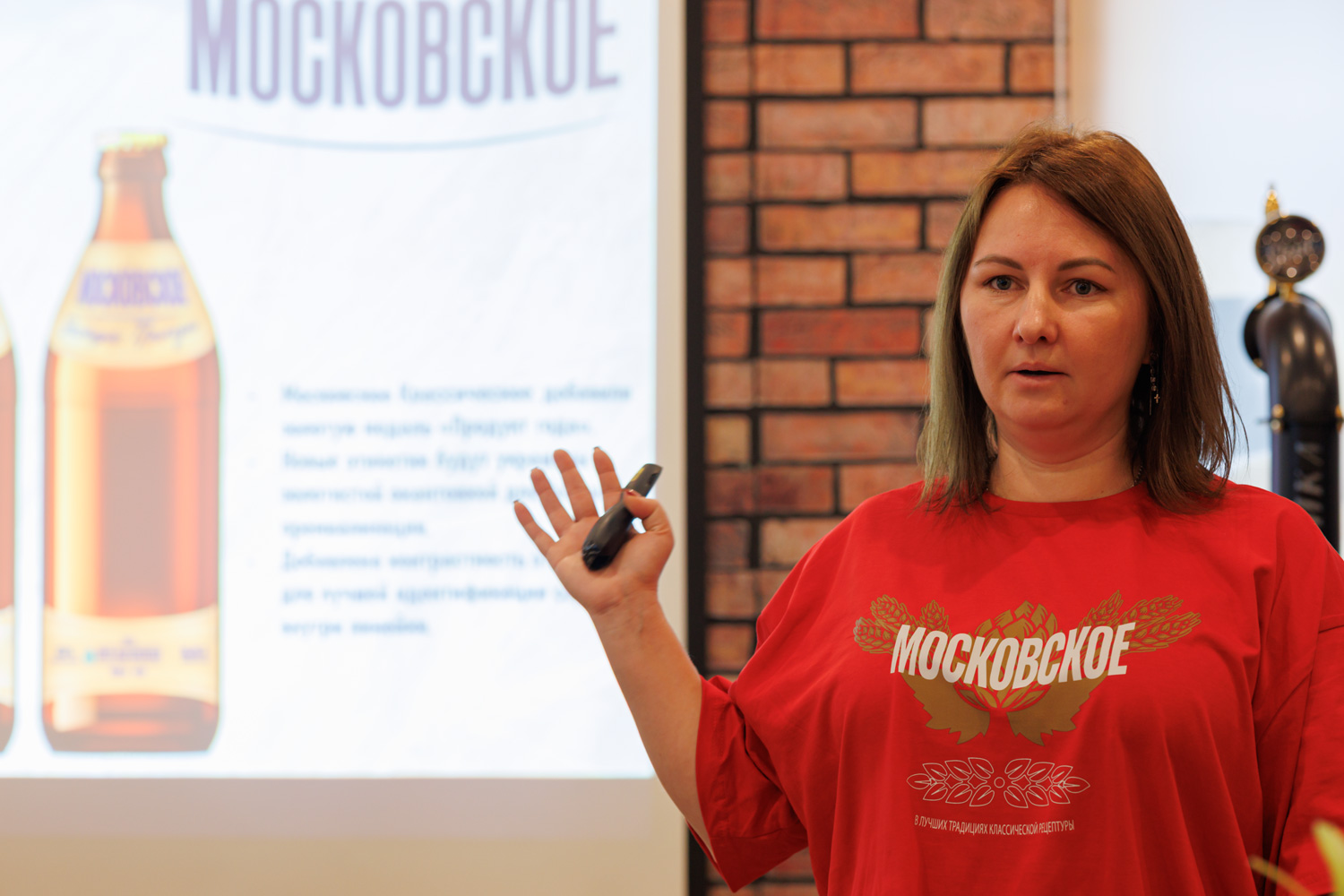 | После экскурсии, для партнеров компании, прошла презентация нового сорта с дегустацией. Я рассказал об истории появления сорта "Московское" в СССР, о возрождении сорта рассказала Марина Веденеева и Александр Иджон поделился своим мнением о тенденциях на современном рынке пива. Одновременно прошла сравнительная дегустация алкогольных сортов "Московского". "Московское" (горечь 12 ibu) - вкус чистый, довольно плотный и полный, солодовый и слегка сладковатый. Пиво мягкое, потому не кажется таким уж крепким. "Московское классическое" (горечь 18 ibu) - здесь все тот же чистый и полный солодовый вкус, но легкая сладость сбалансирована легкой горчинкой. "Московское оригинальное" (горечь 26 ibu) - на мой вкус - здесь уже хороший баланс солода и хмеля, вкус мягкий и потому что хотя пиво плотное и умеренно крепкое, отличная питкость. "Московское экстра пильзен" (горечь 40 ibu) - в первых глотках ощущается только мягкость и солодовость, но постепенно начинает накатывать хмелевая горчинка и в послевкусии хмель уже хорошо различим. Крепость не заметна, пьется отлично. Мне, как любителю горького - очень понравилось, это действительно экстра пилс - плотный и полный, но в тоже время заметно охмеленный, при этом добавление риса делает вкус мягкими, а крепость не столь заметной. Безалкогольную версию пока не попробовали, обещается тоже - довольно охмеленная версия, предполагаю что будут использованы не европейские континентальные хмеля, а скорее американские, они дают не травянистый, а фруктовый вкус, более уместный в безалкогольной версии. |