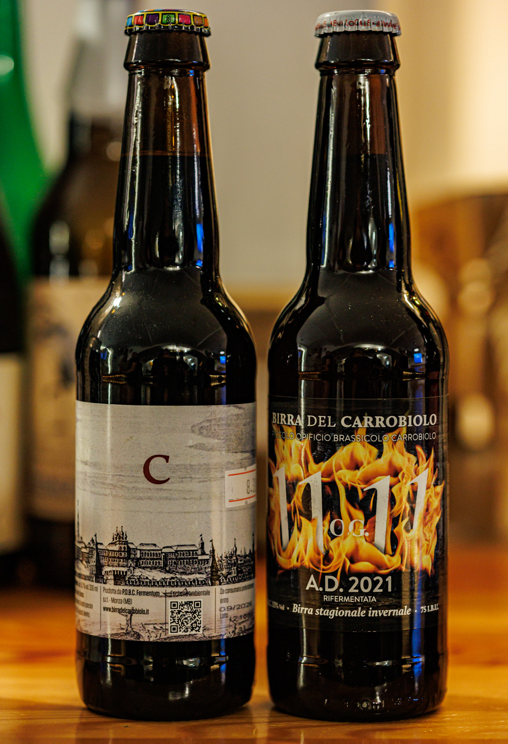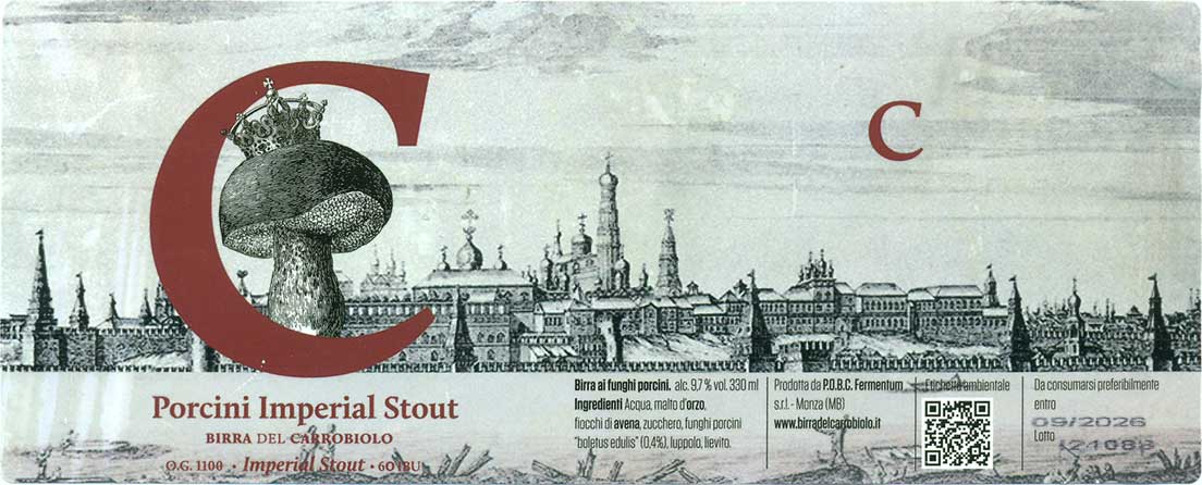 Birra del Carrobiolo, "Porcini Imperial Stout" (Stout - Imperial / Double - с белыми грибами, 10% алкоголя) - аромат очень грибной, правда пахнет не белыми грибами, а скорее поганками. Во вкусе грибов меньше, но они ощутимы, не давят, а создают некую изюминку. В остальном ощутимы темные и карамельные солода, алкоголь скрыт. "O.G. 1111" (Winter Warmer, 26% на 13% алкоголя, 77 ibu) - ощущается копченый вкус - прежде всего копченая груша хотя есть и слегка горелой резины. Высокая, но скрытая крепость, потому заметно и вино. Довольно сложно и интересно.