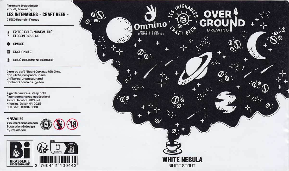 Les Intenables - Craft Beer (совместно с Overground Brewing), "White Nebula" (Stout - White / Golden) - светлый стаут, в аромате ощущается мощный кофе, во вкусе тоже есть кофейные тона - тем и намекают на то, что это стаут.