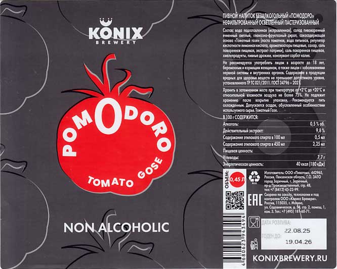 Помидоро. Светлое. Крепость - 0,5% vol. Калорийность - 40 ккал. |