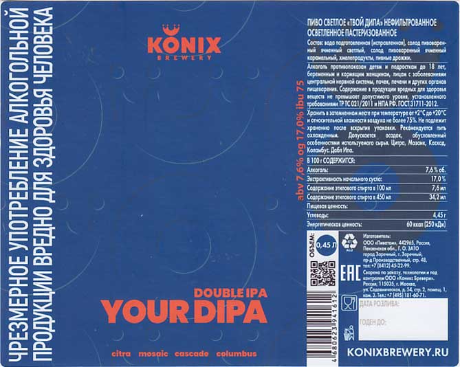 Твой ДИПА. Светлое. Плотность - 17%. Крепость - 7,6% vol. Калорийность - 60 ккал. |