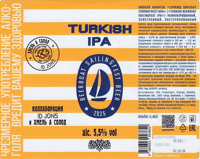 Туркиш, бирбоат сейлингфест ИПА. Светлое. Крепость - 5,5% vol. Калорийность - 55 ккал. |